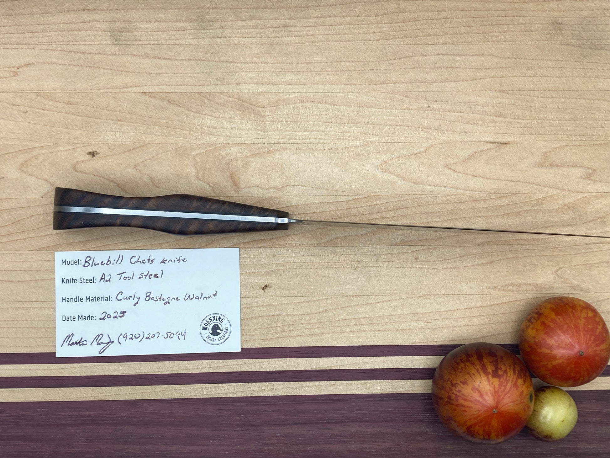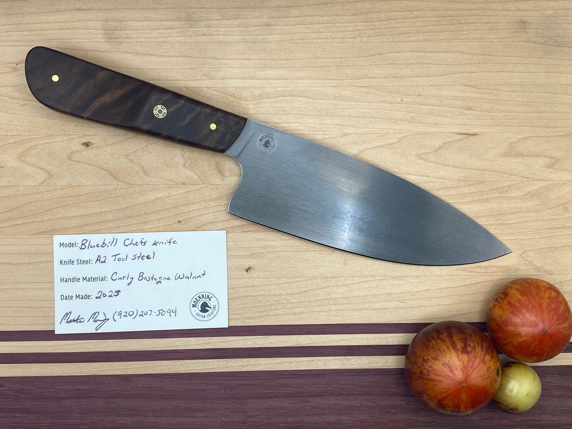 My Bluebill chefs knife is a kitchen workhorse, thinly ground with a great distal taper and at only a 6in blade it is much easier for beginners to pick up and use. The knife is a perfect utility knife in the kitchen with a ton of belly and a fine tip to do any task you ask it to do. The blade is differentially heat treated and has a nice, started patina from acid etching. This will be a wonderful addition to anyone's kitchen.