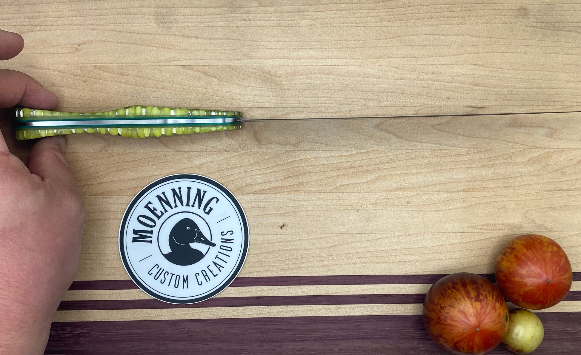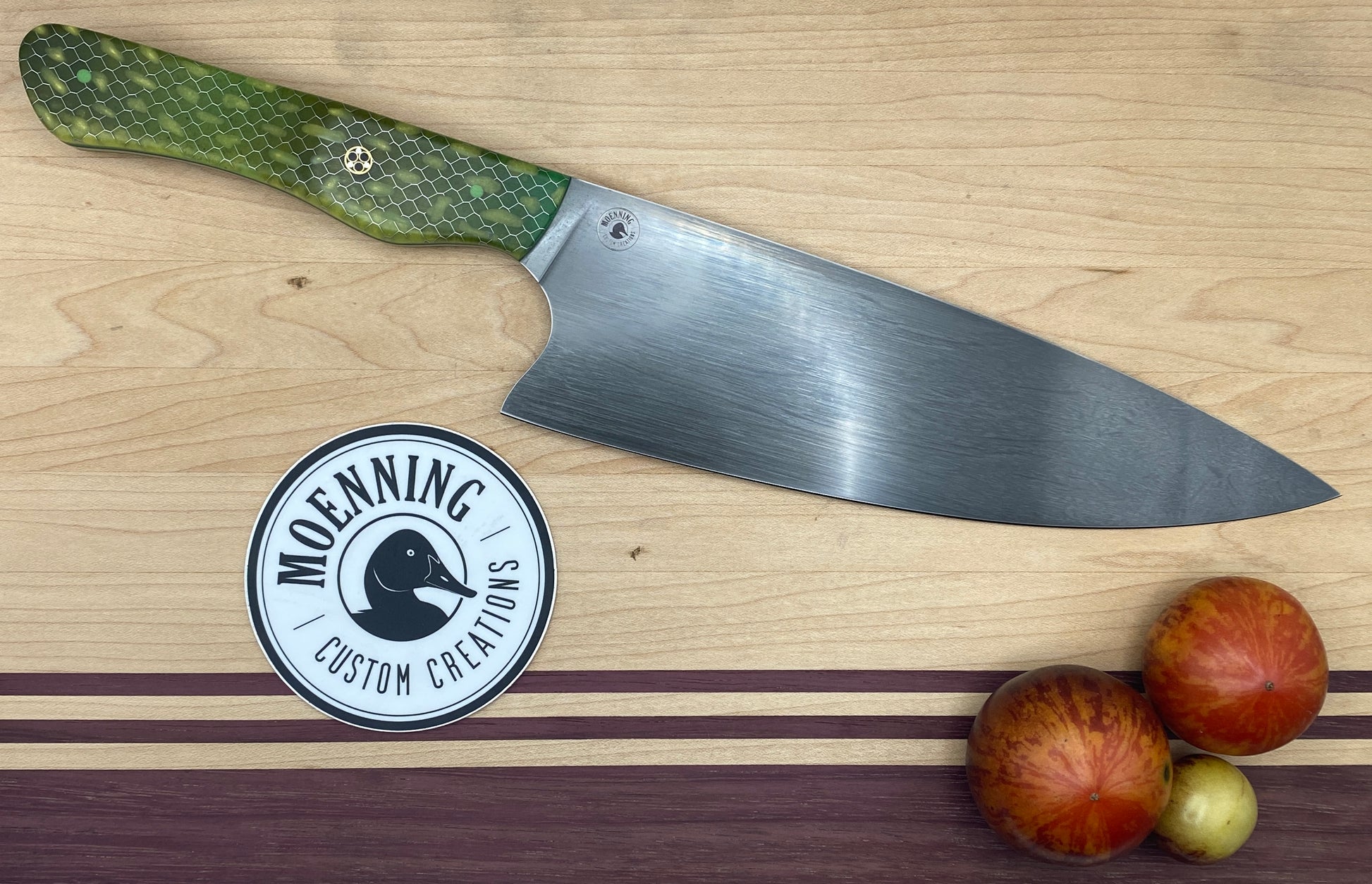 The King Eider is the largest duck species in North America and my King Eider Chefs Knife is the larges model I make, but dont let its size fool you, it is ground thin to be able to slice through just about anything, this keeps the knife well balanced and user friendly. The scales on this knife are super special northern pike themed resin poured into a brass mesh to give a scale look. The blade is differentially heat treated and has a nice, started patina from acid etching. This will be a wonderful addition to anyone's kitchen.